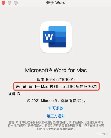 3.许可证显示:“适用于Mac 的 Office LTSC 标准版 XXX”说明Office已成功激活